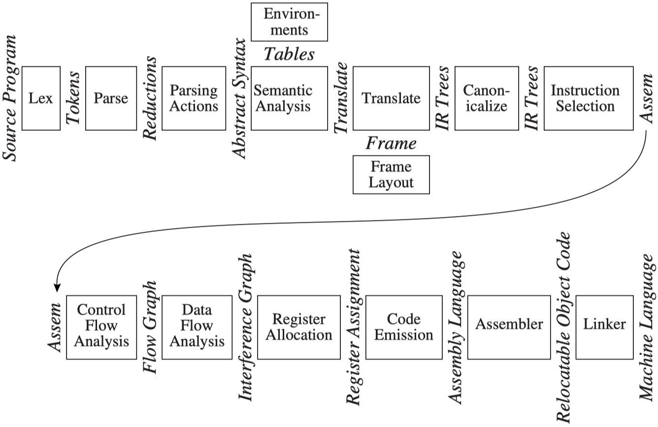 在课本中,一个编译器被划分为了多个模块(阶段)以及模块间的接口: