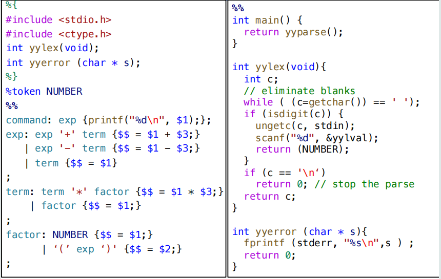 %token关键字来定义一些 token 的名称,例如%token NUMBER定义了一个名为NUMBER的 token,这个 token 的值会保存在全局变量yylval中。- 使用