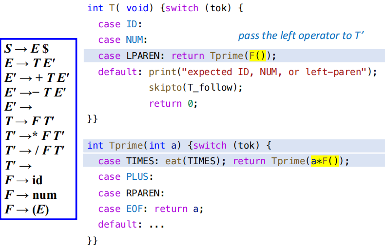 在上图的例子中,我们把 F 的计算结果作为参数传递给 Tprime,即 Tprime(F()),这样在 Tprime 中我们就可以直接使用这个结果,从而实现左结合的语义效果。