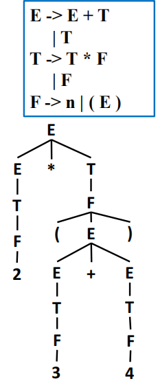 如右图所示的解析树被称为具体解析树(concrete parse tree),它包含了输入字符串的完整结构信息,包括所有的非终结符和终结符节点,直接反映着源语言的具体语法。