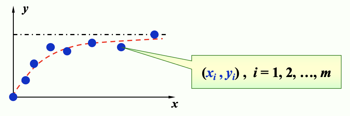 上面这个非线性形式的式子显然不太好计算,我们要把它线性化(linearization):令 \(Y = \dfrac{1}{y}, X = \dfrac{1}{x}\),就变为了 \(Y \approx a + b X\),这就变成了一个线性问题了。