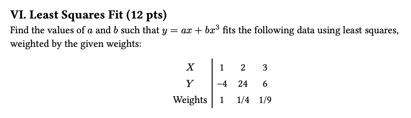 这道题要求我们在逼近时还要考虑各个数据点的权重,带入带权重的 LSA 公式,可以得到一个关于 \(a, b\) 的函数。