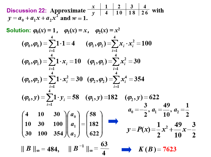 整理可以得到 $$ \sum\limits_{j=0}^n a_j \Big(\sum\limits_{i=1}^m x_i^{j+k}\Big) = \sum\limits_{i=1}^m y_i x_i^k,\quad k = 0, 1, \cdots, n $$