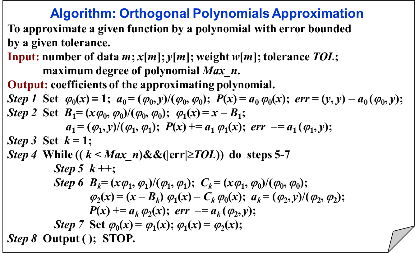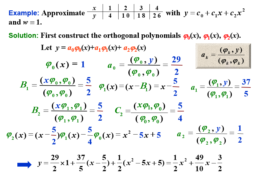 其中 \(k = 2, 3, \cdots, n\),且 \(B_k = \dfrac{(x \varphi_{k-1}, \varphi_{k-1})}{(\varphi_{k-1}, \varphi_{k-1})},\ C_k = \dfrac{(x \varphi_{k-1}, \varphi_{k-2})}{( \varphi_{k-2}, \varphi_{k-2})}\)