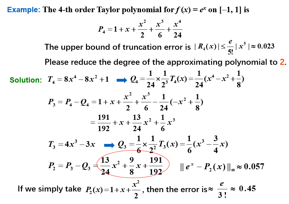 给定 \(P_n(x) \approx f(x)\),幂级数缩减(economization)指的是在确保精度损失最小的情况下,降低多项式的次数。